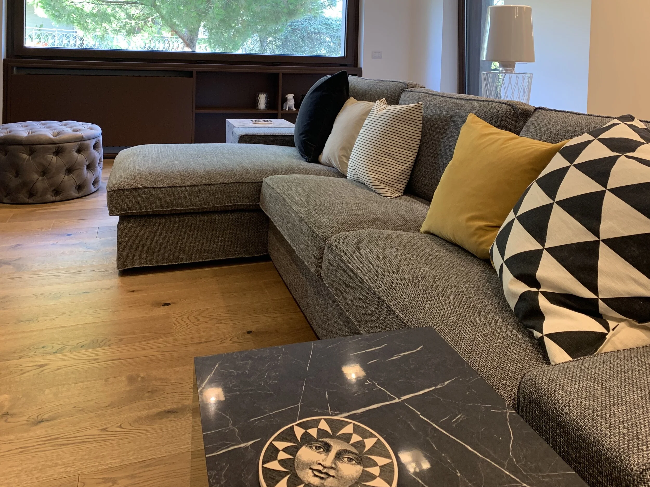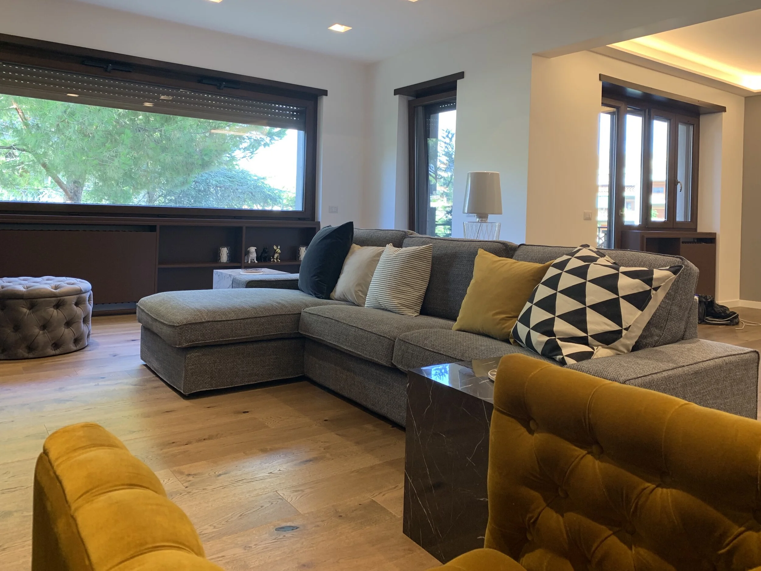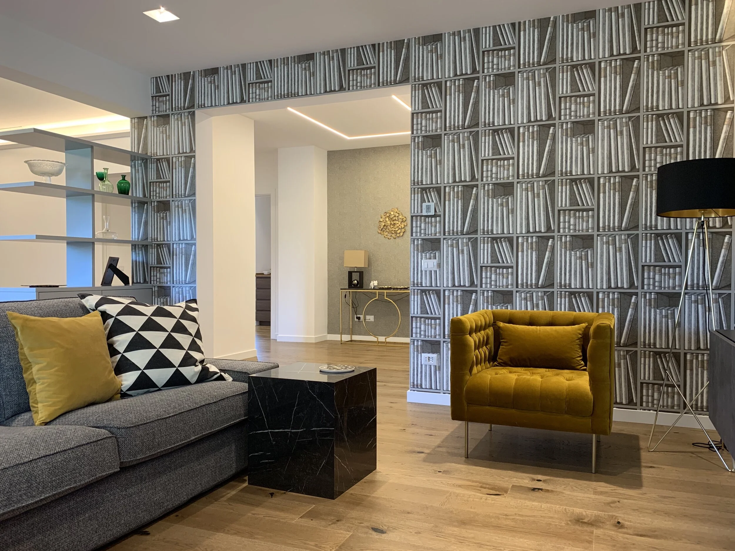 Questo appartamento gode di uno splendido affaccio immerso nel verde. La divisione degli spazi era già sufficientemente funzionale. E’ bastato eliminare qualche chiusura per rendere gli spazi più omogenei e fruibili. Non serve necessariamente una porta od un muro per definire spazi diversi. La progettazione di mobili su misura che tengano conto delle esigenze dello spazio e di chi lo vivrà riescono a suddividere il spazio in maniera più bella esteticamente e sicuramene più funzionale.