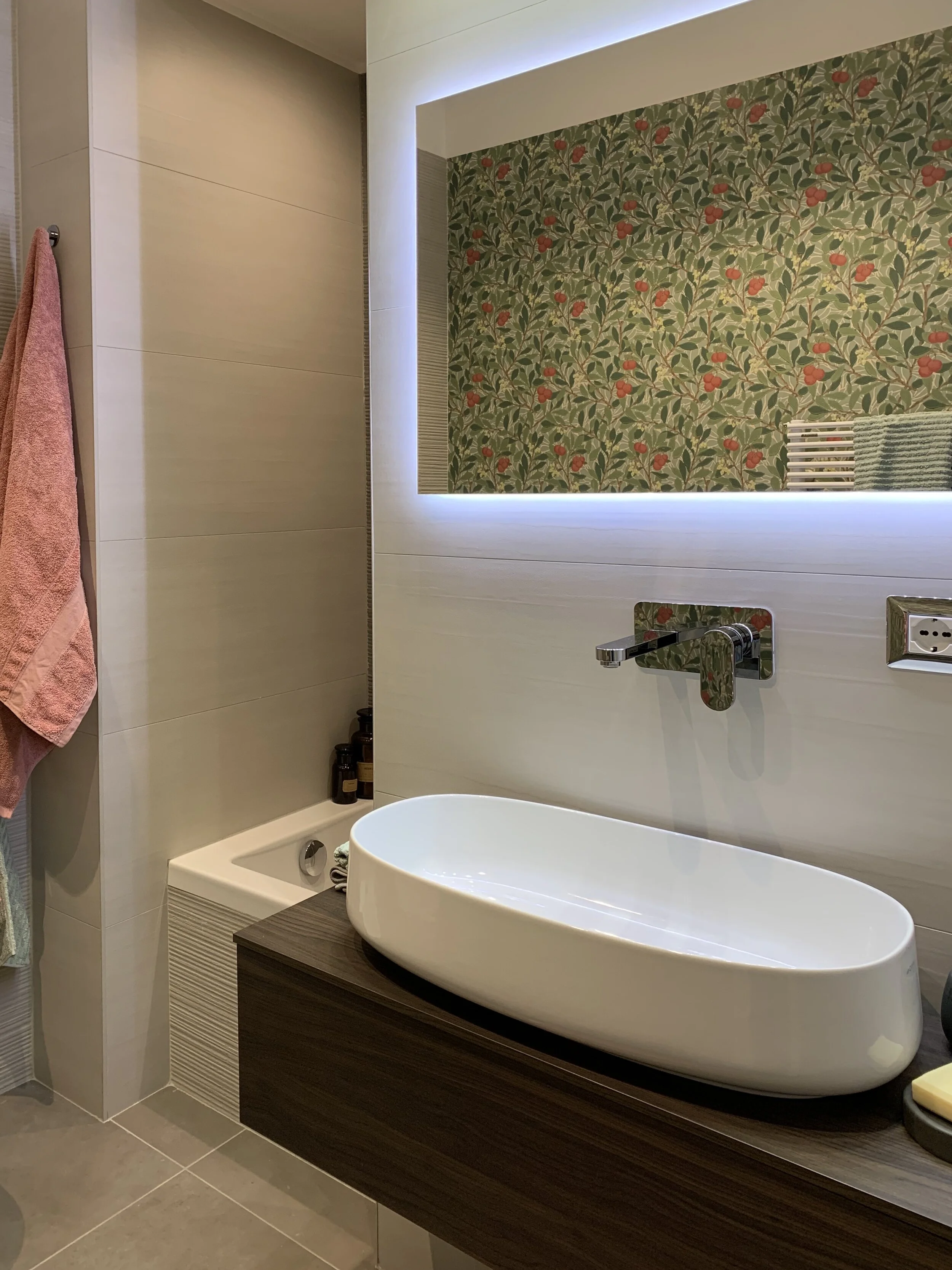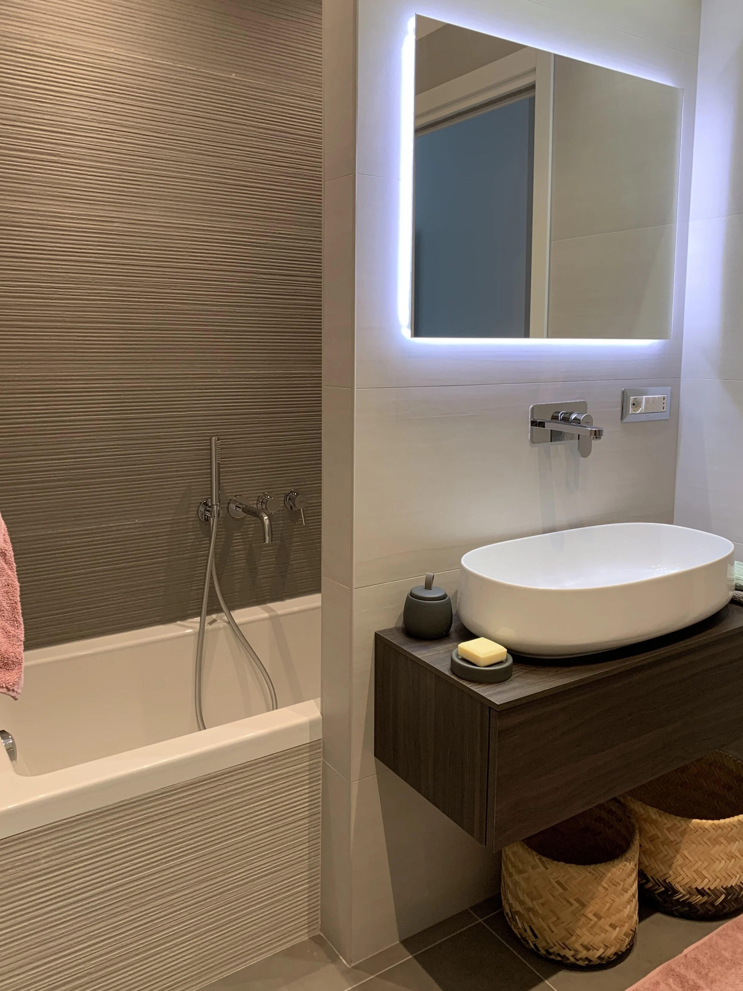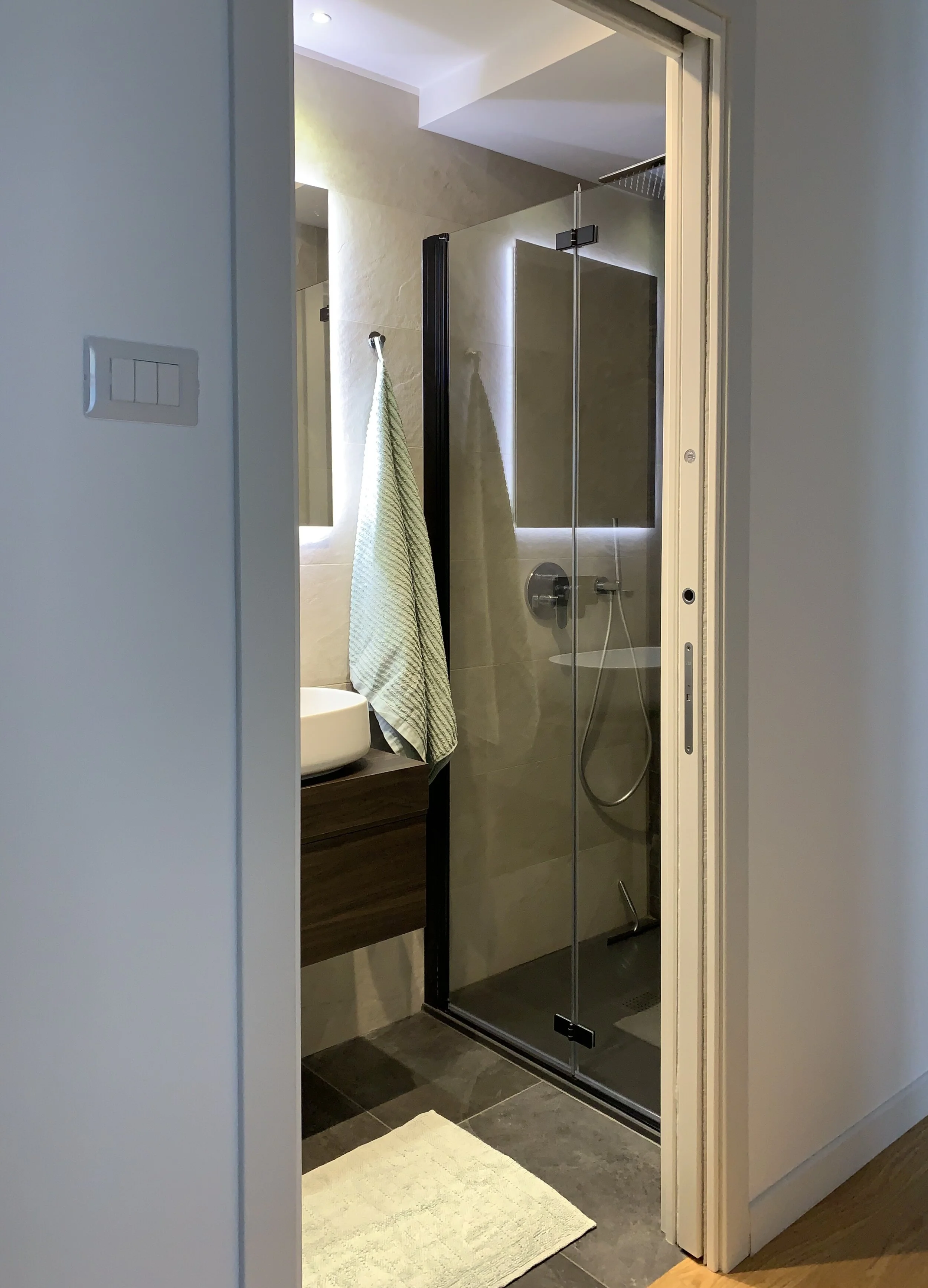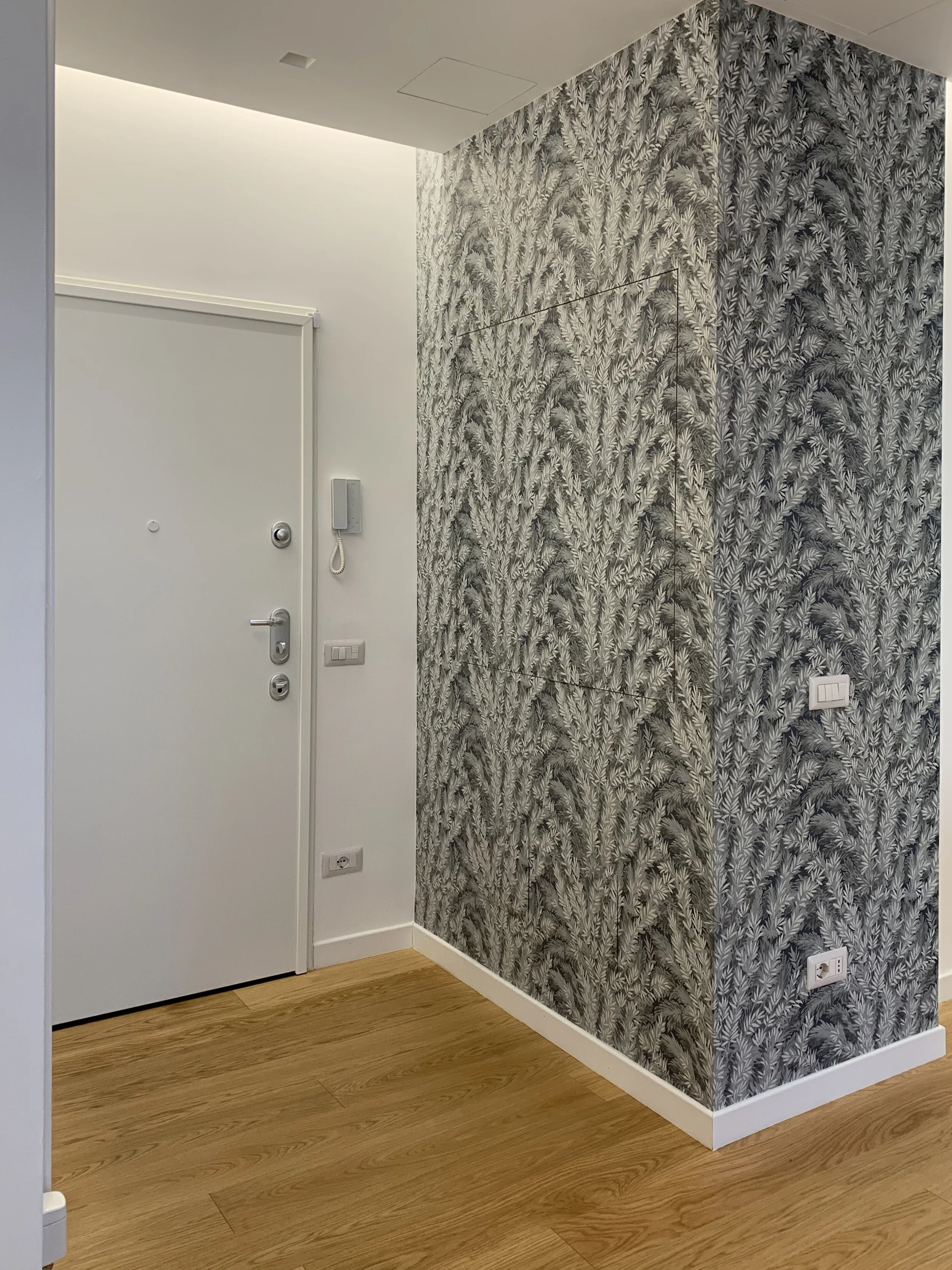 L’ingresso molto ampio è stato ristretto per ricavare un comodo ripostiglio dove posizionare lavatrice/asciugatrice.
