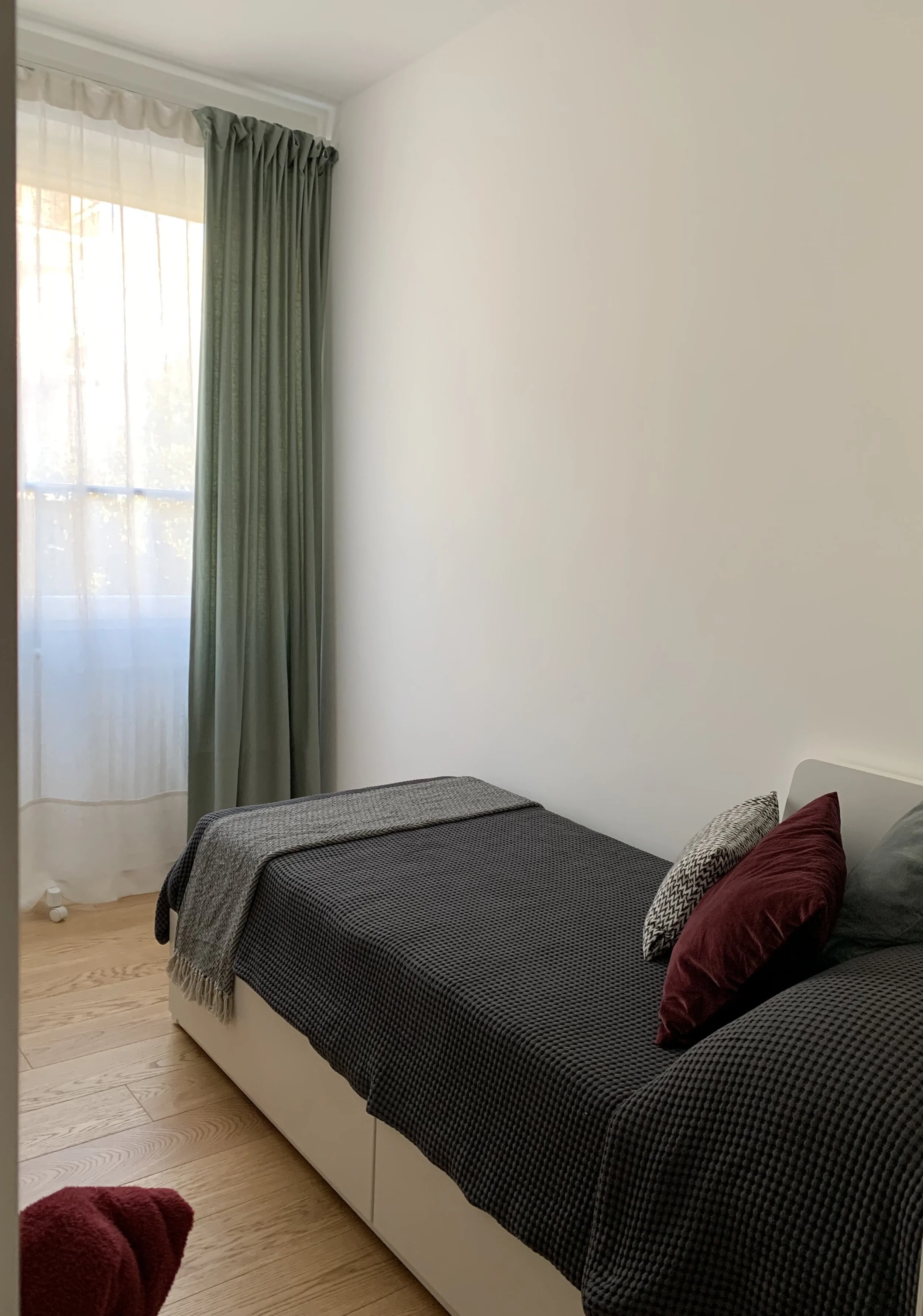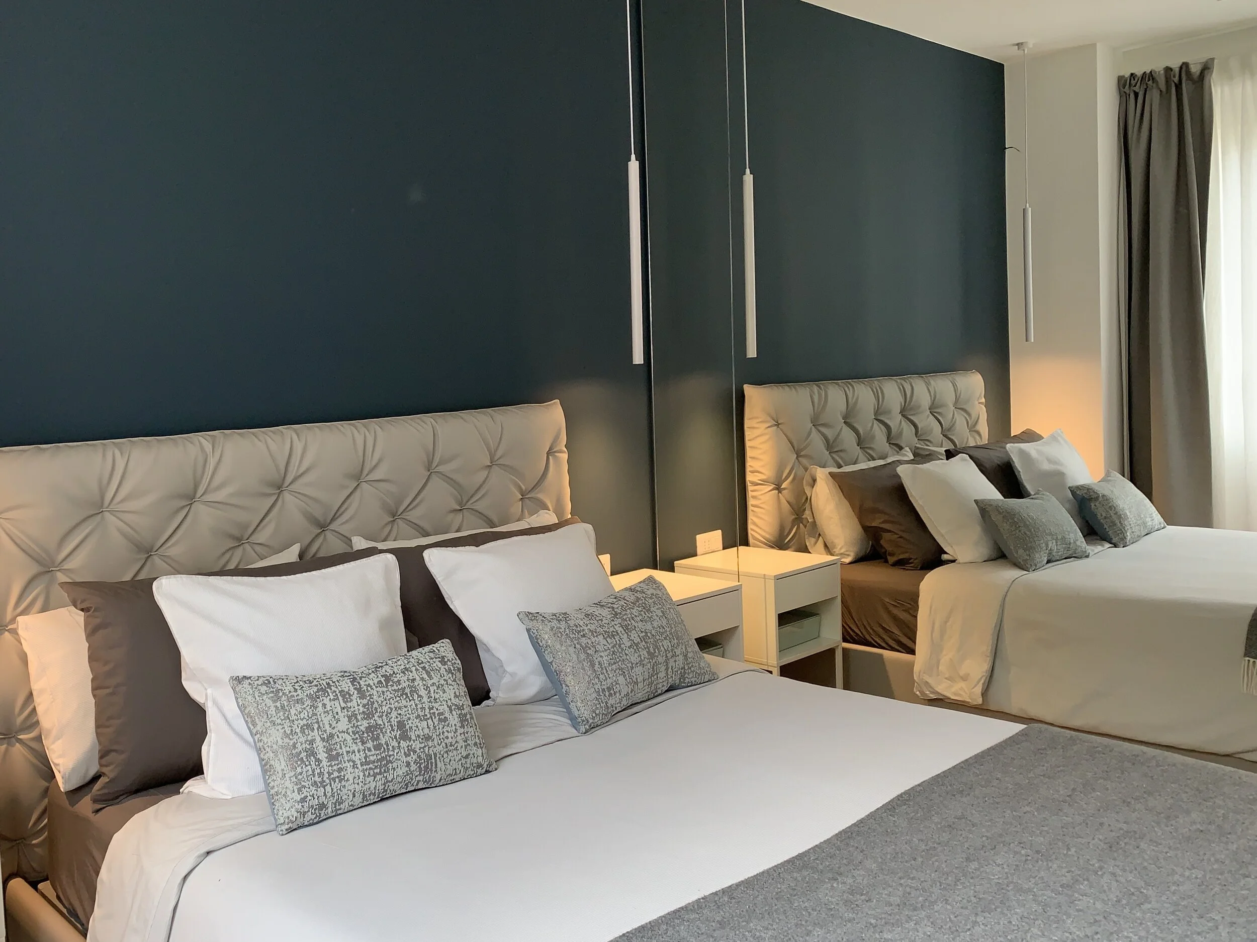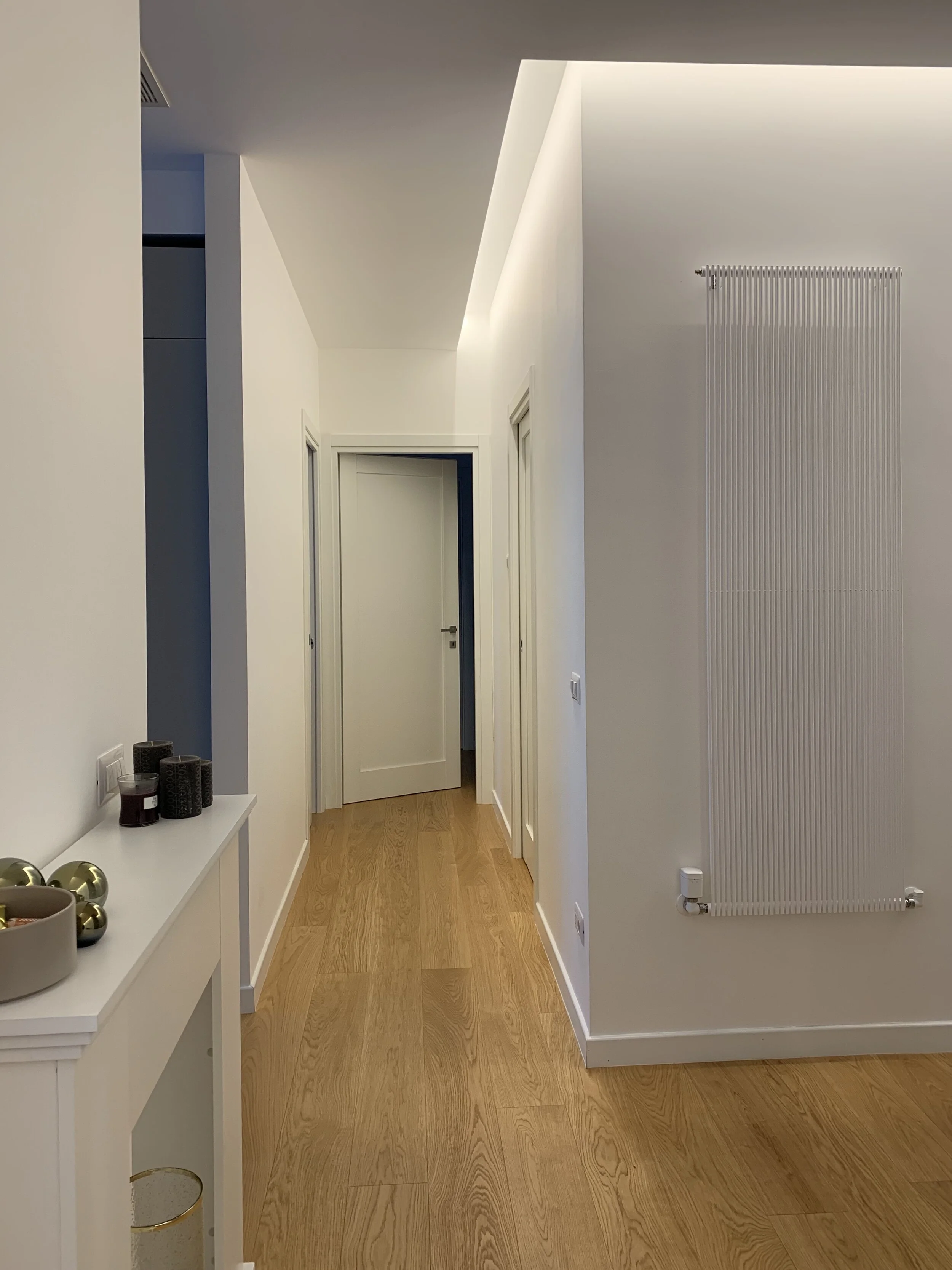 Il secondo ingresso, a mio avviso inutile in appartamento di queste dimensioni (80 mq), è stato sfruttato per creare una cabina armadio a servizio della camera padronale.