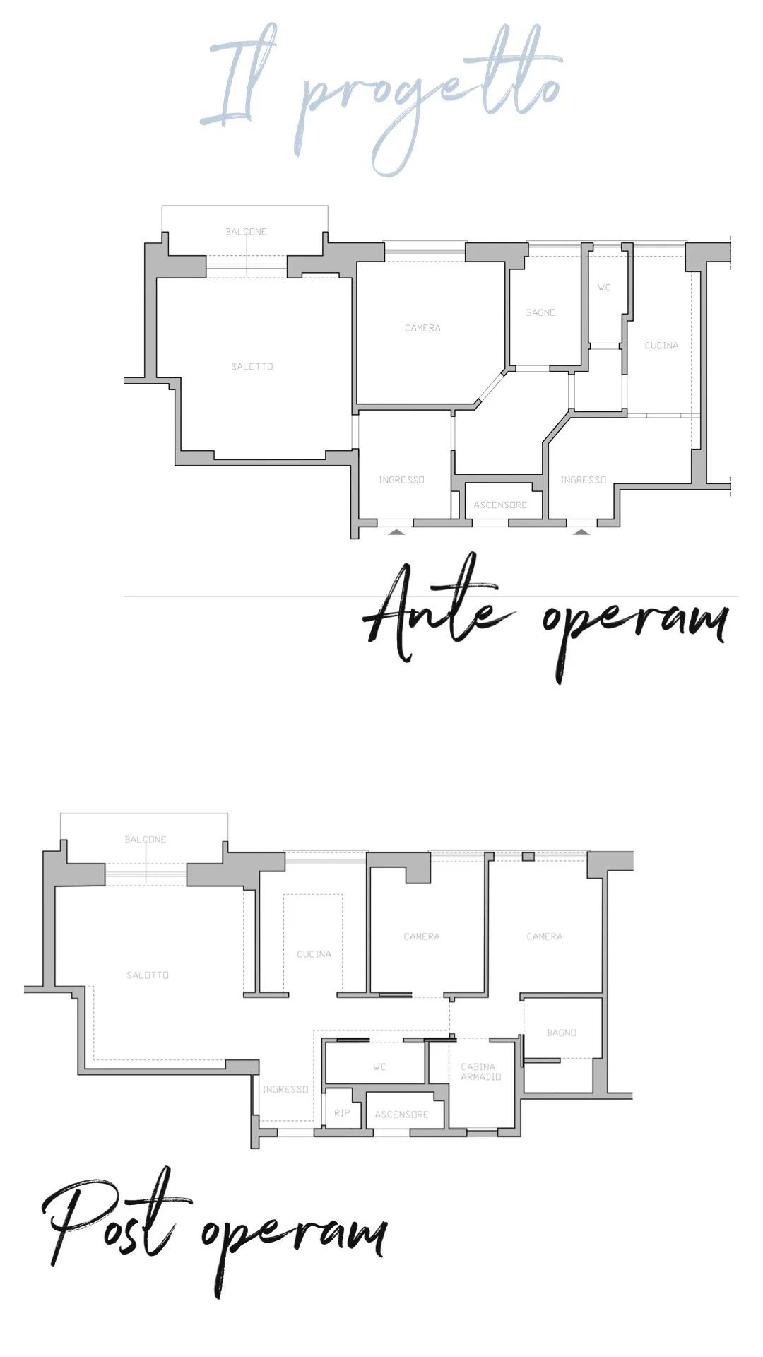Si è passati da un appartamento composto da una sola camera, cucina, salotto e due bagni ad uno molto più funzionale costituito da due camere, salotto/pranzo, una cucina più spaziosa e vicina alla zona giorno, due bagni, ripostiglio e cabina armadio!